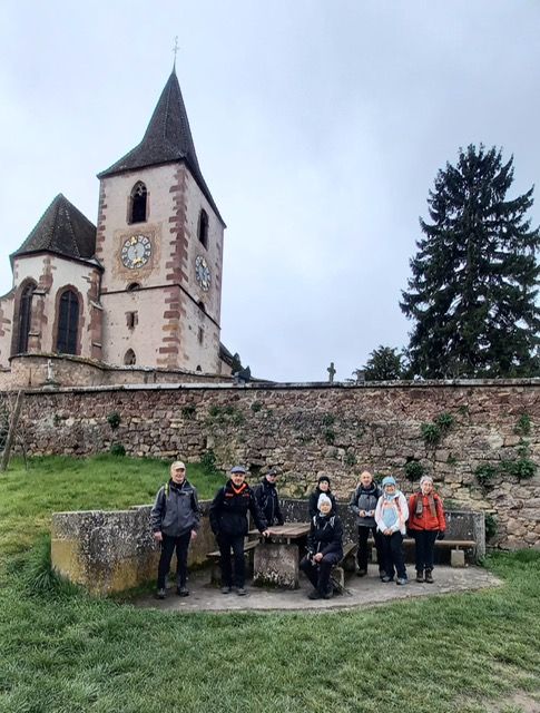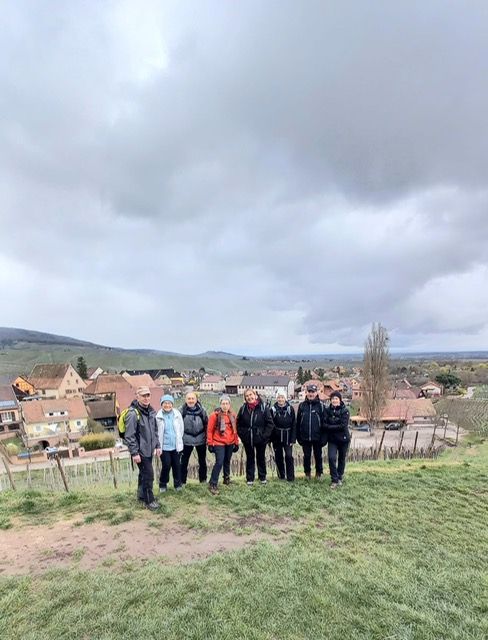Neuf cyclos ont randonné ce samedi 14mars dans les vignobles alsaciens. Malgré un temps neigeux au départ de Gérardmer, ils ont eu la chance de marcher sous un ciel gris mais sans pluie. Ils ont découvert la colline des amandiers,les villages de Beblenheim, Zellenberg, Hunawirh et son église fortifiée (repas de midi au restaurant l’O’berge du Parc), puis Riquewihr et Mittelwirh. Trois personnes non marcheuses les ont rejoint pour le déjeuner et ont visité le beau village d’Hunawirh.