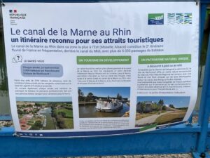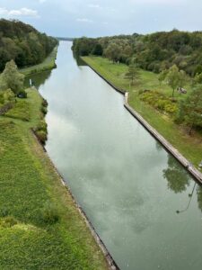 C’est au bord du canal de la Marne au Rhin que nous arrivons à Laneuveville ; là, nous empruntons la rive du canal de jonction (onze écluses), puis le canal de dérivation qui va nous emmener vers les <boucles de la Moselle> et surtout vers le restaurant « les pieds dans l’eau » à Messein. Repas et accueil sympa.