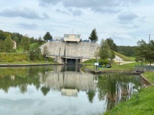 Nous avons emprunté les pistes cyclables le long de différents canaux (Marne au Rhin, Houillières), découvert une multitude d’étangs (Gondrexange, Stock, Réchicourt, Laixière, etc…) ; nous avons pris le repas de midi au bord de l’étang du Stock avant de repartir et faire une halte à la grande écluse (impressionnante – chute d’eau comprise entre 15m45 et 16m10) de Réchicourt-le-Château ; nous nous sommes arrêtés également à l’ancienne usine BATA, avant de découvrir la magnifique ferme de Hellocourt à proximité, puis rejoindre notre point de départ.